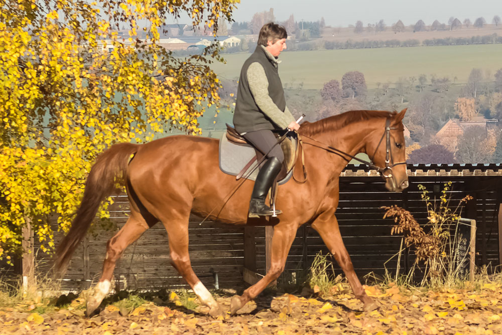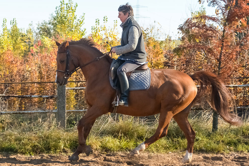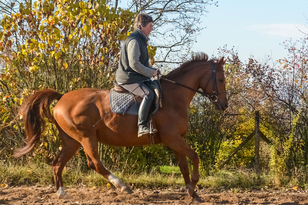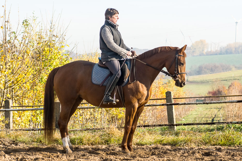 Kein Anfängerpferd, verträgt keinen Druck. Sie ist dressurmäßig L-angeritten, wurde schon von einem Mädchen auf einem Turnier vorgestellt.